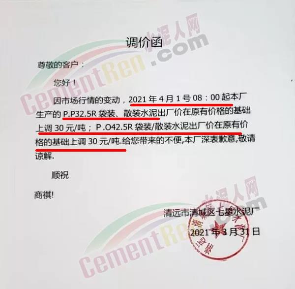 清遠市清城區七星水泥廠通知,自4月1日起各品種水泥上調30元/噸。