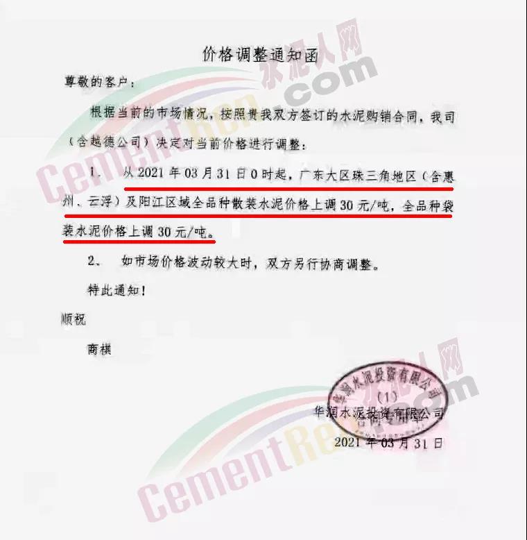華潤水泥投資有限公司通知,自3月31日0時起,廣東珠三角地區(含惠州、云浮)及陽江全區域全品種袋裝和散裝水泥價格上調30元/噸。