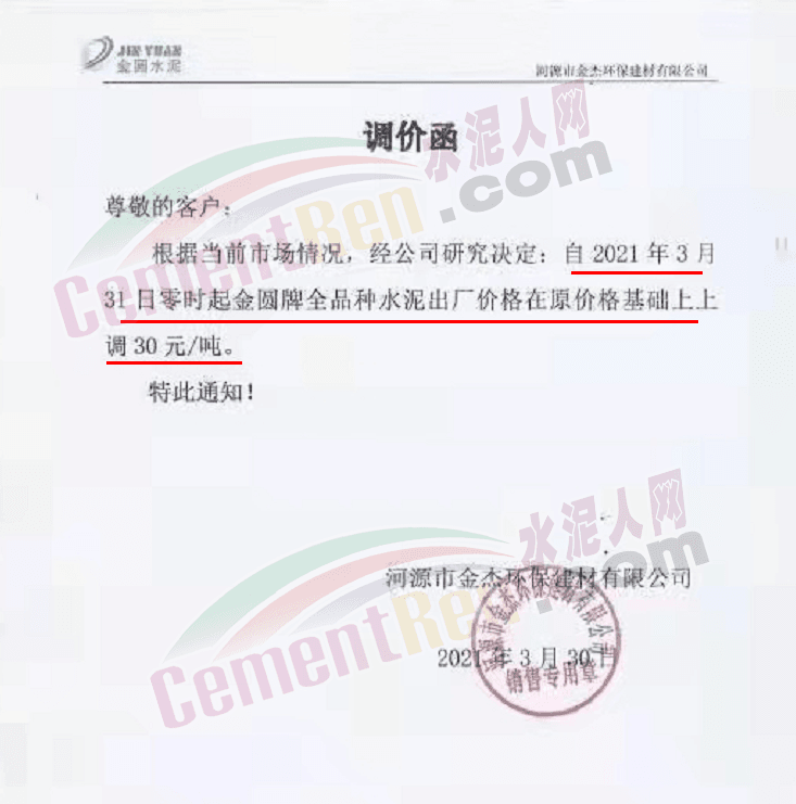 河源市金杰環保建材有限公司通知,自3月31日零時起金圓牌全品牌水泥出廠價上調30元/噸。