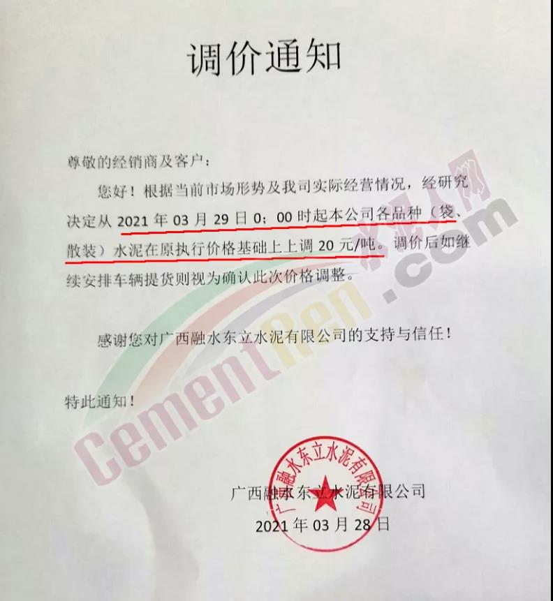 廣西融水東立水泥有限公司通知自3月29日0時起各品種水泥在原執行價格基礎上上調20元/噸。