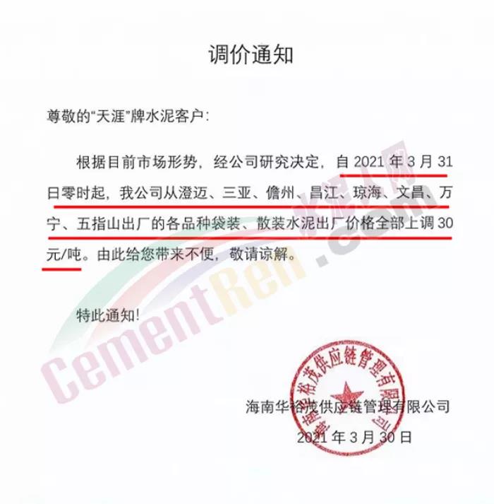 海南華裕茂供應鏈管理有限公司通知自3月31日零時起,公司從澄邁、三亞、儋州、昌江、瓊海、文昌、萬寧、五指山出廠的各品種袋裝、散裝水泥出廠價全部上調30元/噸。