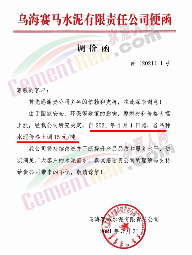 烏海賽馬水泥通知,自4月1日起各品種水泥上調15元/噸。