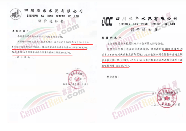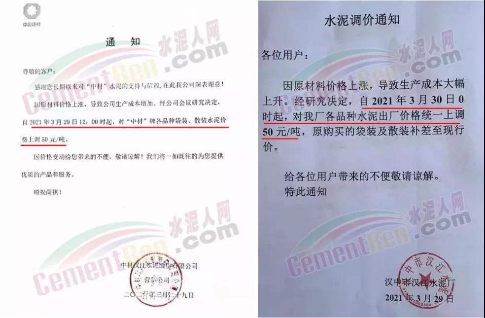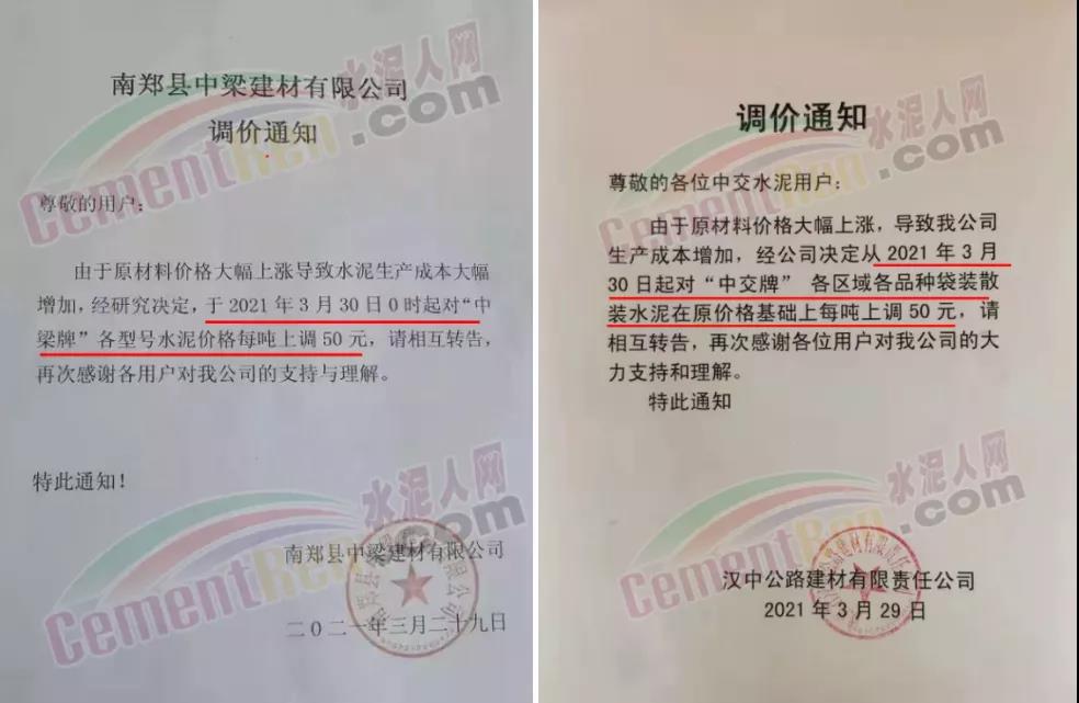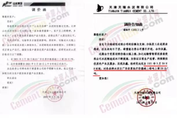 中材天山珠海水泥、中材亨達水泥通知自3月31日零點起,公司全品種散裝、袋裝水泥在原價基礎上上調30元/噸。