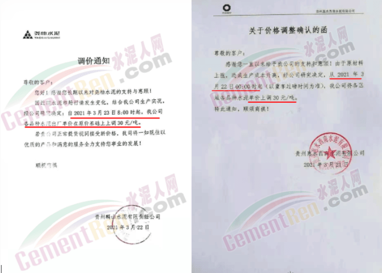 3月下旬貴州紫云西南水泥、惠水西南、華潤水泥(安順)公司、臺泥(安順)公司、貴州超宇水泥、貴州麟山水泥通知上調水泥價格30元/噸。