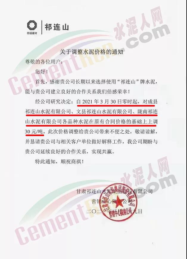 甘肅祁連山水泥集團有限公司營銷中心隴南公司通知,自3月30日零時起,對成縣祁連山水泥、文縣祁連山水泥、隴南祁連山水泥各品種水泥在原合同價格的基礎上調30元/噸。