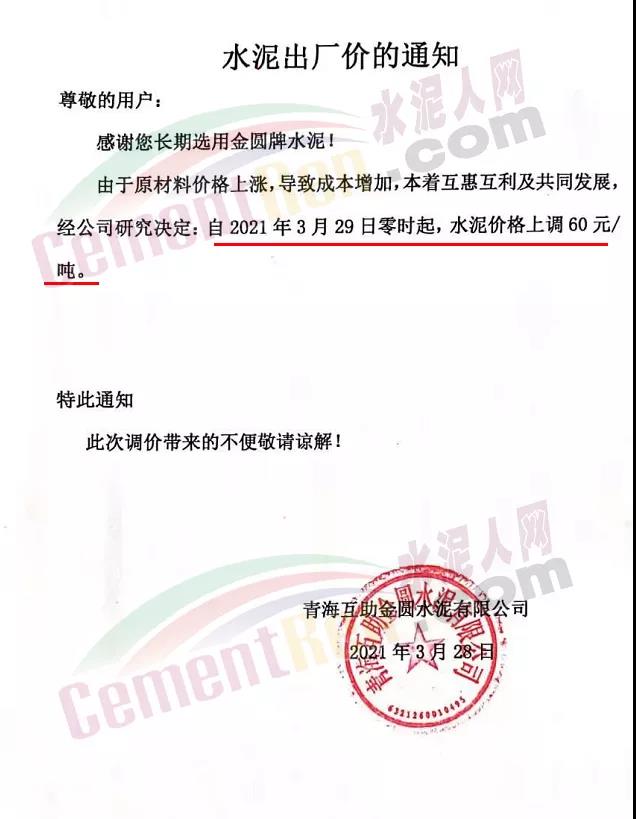 青海互助金圓水泥有限公司通知3月29日起水泥價格上調60元/噸。