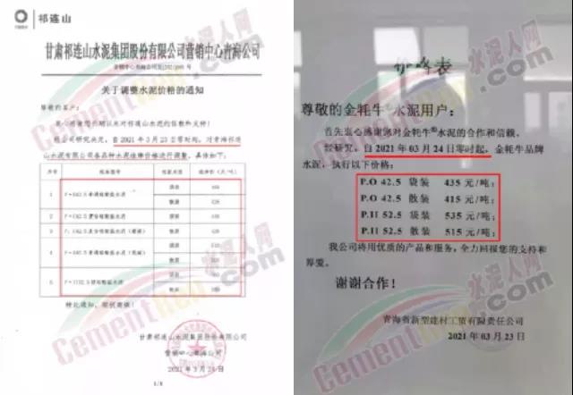 3月22日青海區域主要品牌企業祁連山水泥通知上調65元/噸。上調后,PO42.5散裝水泥報價415-430元/噸,P.II52.5級散裝水泥報價515-550元/噸。