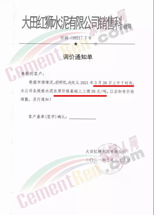 3月25日大田紅獅水泥通知自3月26日上午7時起,各規格水泥上調30元/噸。