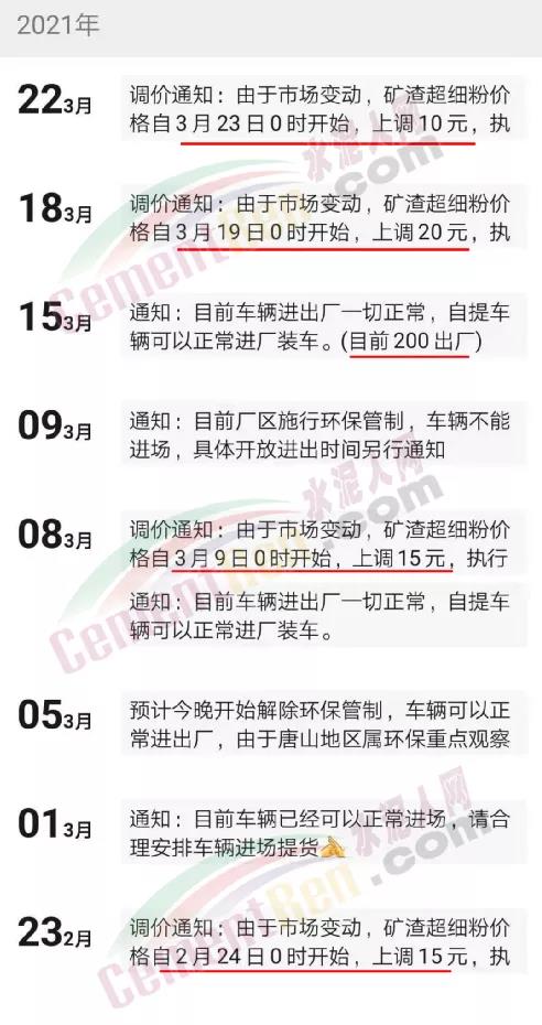 以唐山地區為例,礦渣細粉價格已經連續四輪上漲,累計上調60元/噸。從唐山區域某礦粉經銷售商近一個月的通知可見礦粉供應日趨緊從2月下旬就開始了,目前的執行價格已經突破200元/噸。
