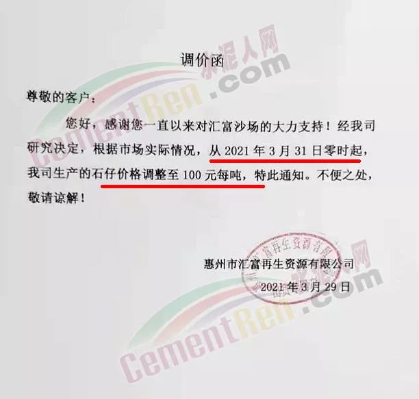 日前惠州市匯富再生資源有限公司通知,根據市場實際情況從4月3日零時起,公司生產的沙子價格調整至100元/噸。據了解,3月20日企業發布的調價函稱,沙子價格調整至95元/噸。同期,企業發布調價通知稱,3月31日零時起公司生產的石子價格調整至100元/噸。