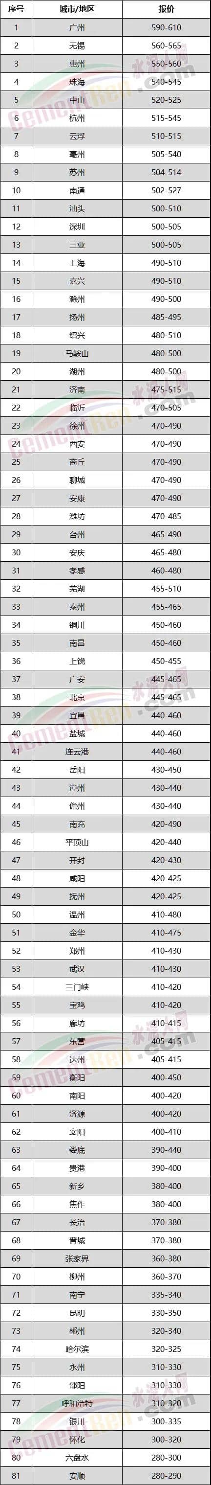 從水泥人網信息中心重點監管區域數據來看,廣州區域C30混凝土報價590-610元/方,突破600元/方大關,除廣東省大部分區域外,江蘇、浙江、安徽、海南、上海、山東省部分區域過500元/方。