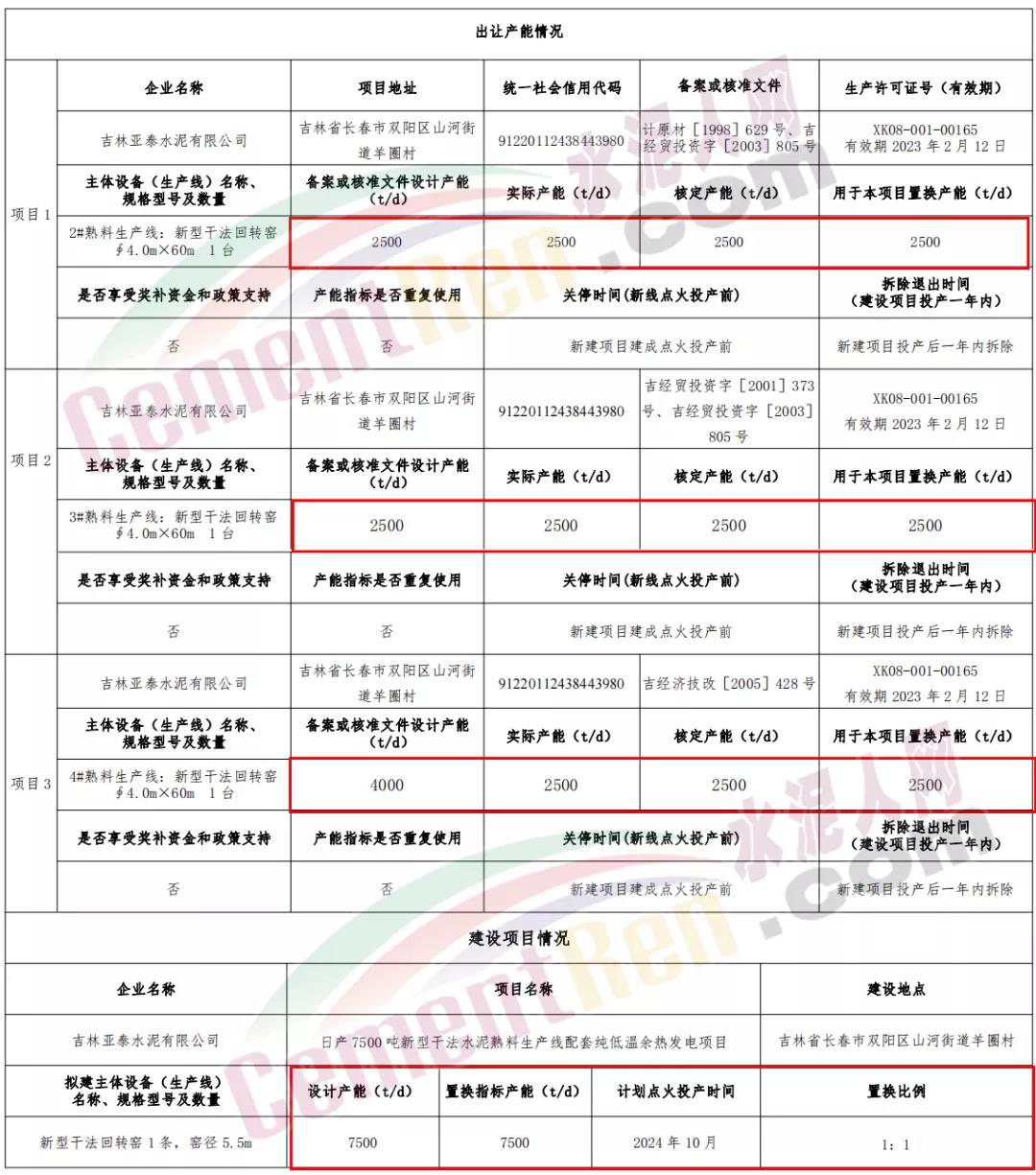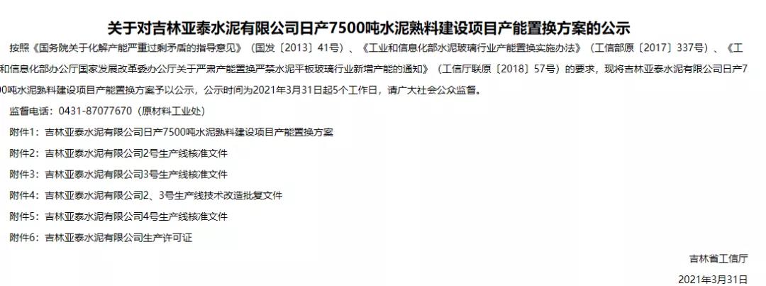 3月31日吉林省工信廳發布《關于對吉林亞泰水泥有限公司日產7500噸水泥熟料建設項目產能置換方案的公示》稱,按照相關文件要求,將吉林亞泰水泥有限公司7500t/d水泥熟料建設項目產能置換方案予以公示,公示時間為2021年3月31日起5個工作日。