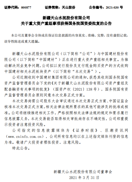 公司近期收到中國建材的通知,獲悉其收到國務院國資委下發(fā)的《關于新疆天山水泥股份有限公司資產(chǎn)重組及配套融資有關事項的批復》,國務院國資委原則同意本次交易正式方案。