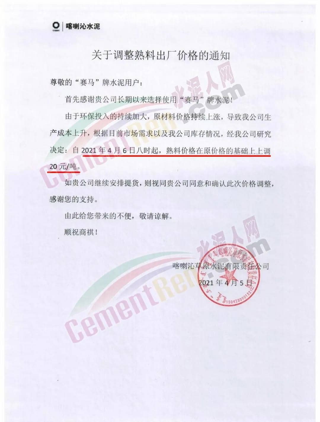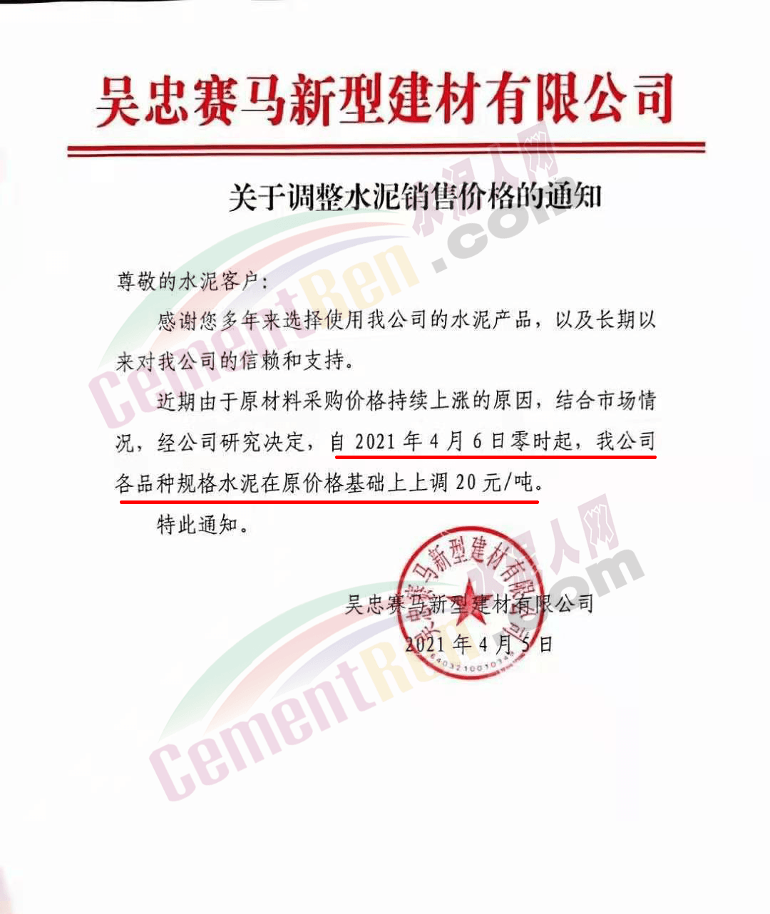尊敬的客戶:根據目前市場行情,經公司研究決定,自2021年4月8日零時起我司發往各區域的各品種各型號水泥出廠單價上調40元/噸 。