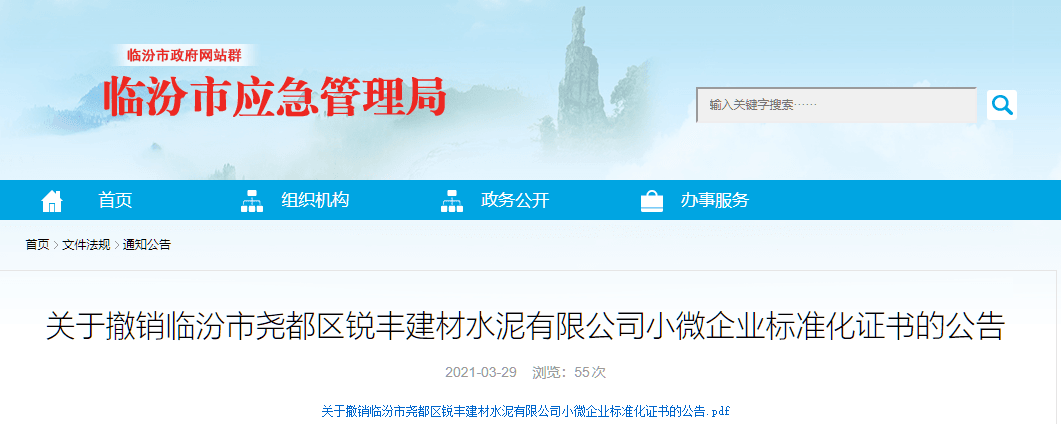 根據《山西省安全生產監督管理局關于進一步規范冶金工貿企業安全生產標準化評審工作的通知》(晉安監發〔2016〕264 號)有關規定,決定撤銷其安全生產標準化建材小微企業達標證書。