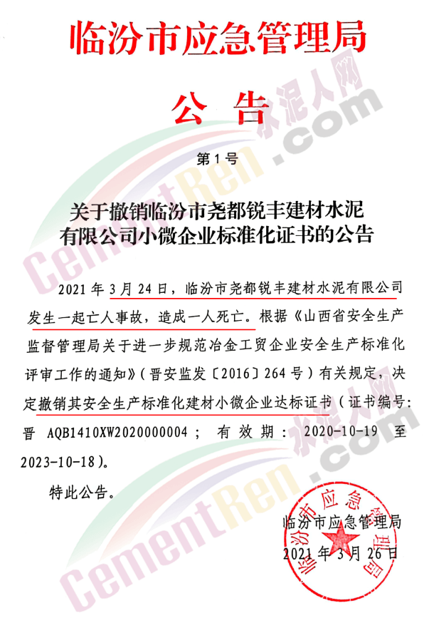 日前,山西臨汾市應急管理局發布公告稱,2021年 3月 24日,臨汾市堯都銳豐建材水泥有限公司發生一起亡人事故,造成一人死亡。