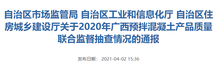為加強預(yù)拌混凝土產(chǎn)品生產(chǎn)領(lǐng)域質(zhì)量監(jiān)督管理,維護(hù)廣大消費者合法權(quán)益,根據(jù)《中華人民共和國產(chǎn)品質(zhì)量法》《產(chǎn)品質(zhì)量監(jiān)督抽查管理暫行辦法》《廣西壯族自治區(qū)促進(jìn)散裝水泥發(fā)展和應(yīng)用條例》等法律法規(guī)有關(guān)規(guī)定,自治區(qū)市場監(jiān)管局、自治區(qū)工業(yè)和信息化廳、自治區(qū)住房城鄉(xiāng)建設(shè)廳聯(lián)合開展了2020年預(yù)拌混凝土產(chǎn)品質(zhì)量監(jiān)督抽查。現(xiàn)將具體情況通報如下: