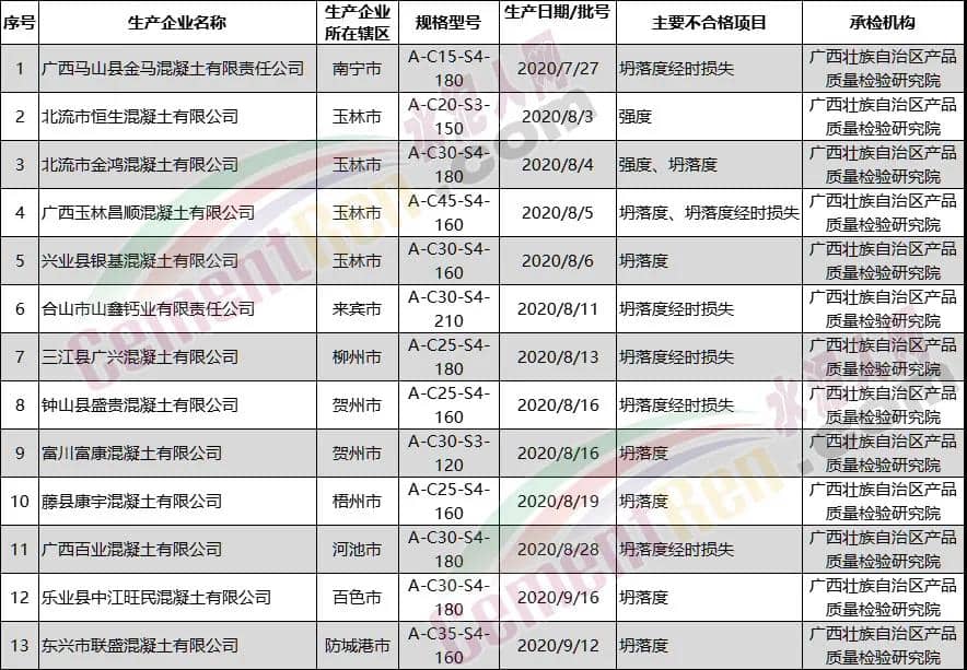 近日,廣西壯族自治區(qū)市場監(jiān)管局、廣西壯族自治區(qū)工業(yè)和信息化廳、廣西壯族自治區(qū)住房城鄉(xiāng)建設(shè)廳聯(lián)合發(fā)布《關(guān)于2020年廣西預(yù)拌混凝土產(chǎn)品質(zhì)量聯(lián)合監(jiān)督抽查情況的通報》。通報顯示,2020年共抽取廣西101家預(yù)拌混凝土企業(yè)生產(chǎn)的101批次產(chǎn)品,經(jīng)檢驗, 合格產(chǎn)品88批次,不合格產(chǎn)品13批次,不合格產(chǎn)品檢出率為12.9%。不合格項目涉及 坍落度、坍落度經(jīng)時損失、抗壓強度。