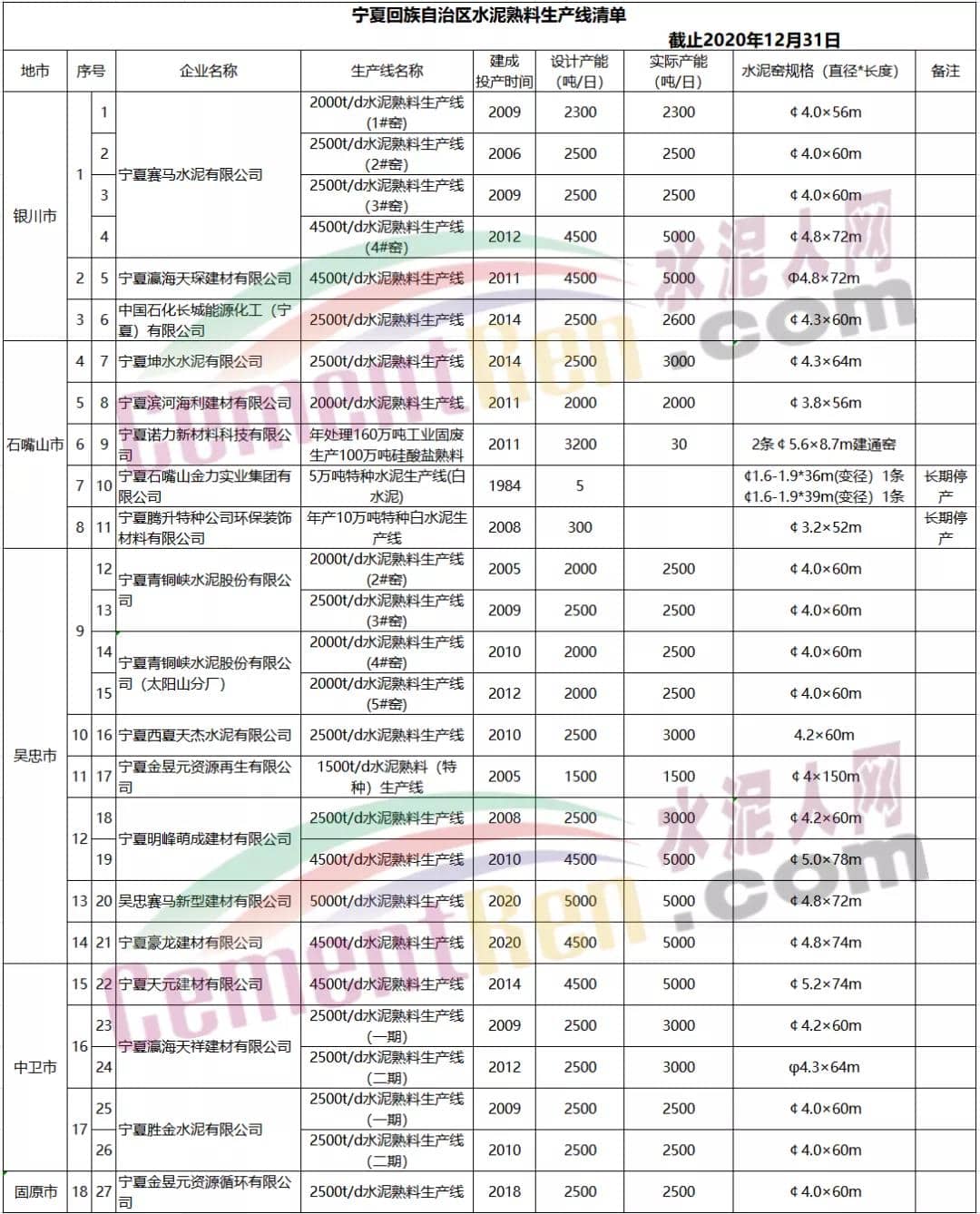日前,寧夏回族自治區工業和信息化廳公開了全區水泥熟料生產線清單截止時間為2020年12月31日。清單顯示,寧夏回族自治區18家水泥企業27條熟料生產線,合計產能達2277.9萬噸。 其中寧夏石嘴山金力實業集團有限公司5萬噸特種水泥生產線(白水泥)和寧夏騰升特種公司環保裝飾材料有限公司年產10萬噸特種白水泥生產線長期停產。 (點開圖片放大瀏覽)