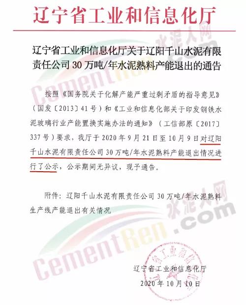 據了解,去年10月10日,遼寧省工信廳發布了《遼寧省工業和信息化廳關于遼陽千山水泥有限責任公司30萬噸/年水泥熟料產能退出的通告》對遼陽千山水泥有限責任公司30萬噸/年水泥熟料產能退出情況進行公示,赤峰山水遠航水泥有限公司及廣西合山虎鷹建材有限公司分別受讓750t/d水泥熟料產能、250t/d水泥熟料產能。