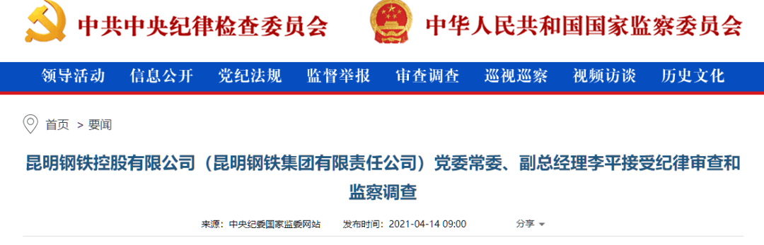 中央紀委國家監委網站訊 據云南省紀委監委消息:昆明鋼鐵控股有限公司(昆明鋼鐵集團有限責任公司)黨委常委、副總經理李平涉嫌嚴重違紀違法,已主動投案,目前正在接受紀律審查和監察調查。