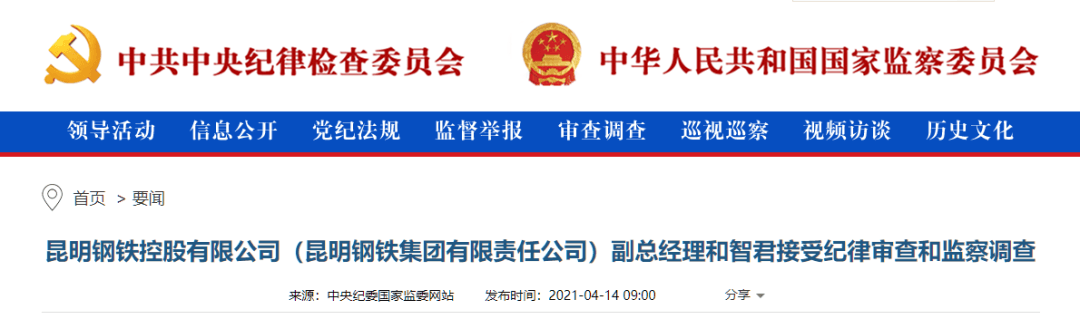 中央紀委國家監委網站訊 據云南省紀委監委消息:昆明鋼鐵控股有限公司(昆明鋼鐵集團有限責任公司)副總經理和智君涉嫌嚴重違紀違法,已主動投案,目前正在接受紀律審查和監察調查。