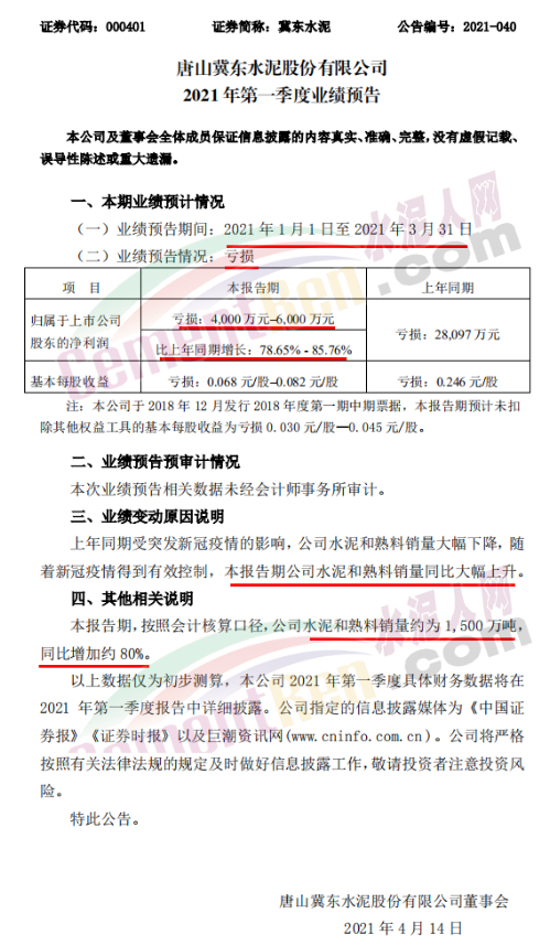 冀東水泥(000401.SZ)4月13日晚間披露2021年一季度業(yè)績預(yù)告。報(bào)告期內(nèi),預(yù)計(jì)實(shí)現(xiàn)歸屬于上市公司股東的凈利潤虧損4000萬元–6000萬元,較上年同期虧損2.81億元,虧損范圍大幅縮小。