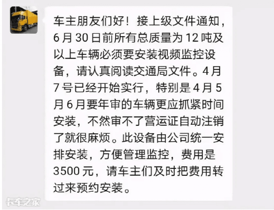 根據規定,為重卡加裝視頻監控是免費的,但是,陸續有卡友反饋,車隊喊他們去裝視頻監控,需要卡友們自己付費,金額在3000元左右,不裝的話,以后車輛年審就過不了。這里就出現了一個問題,到底是誰在收費?