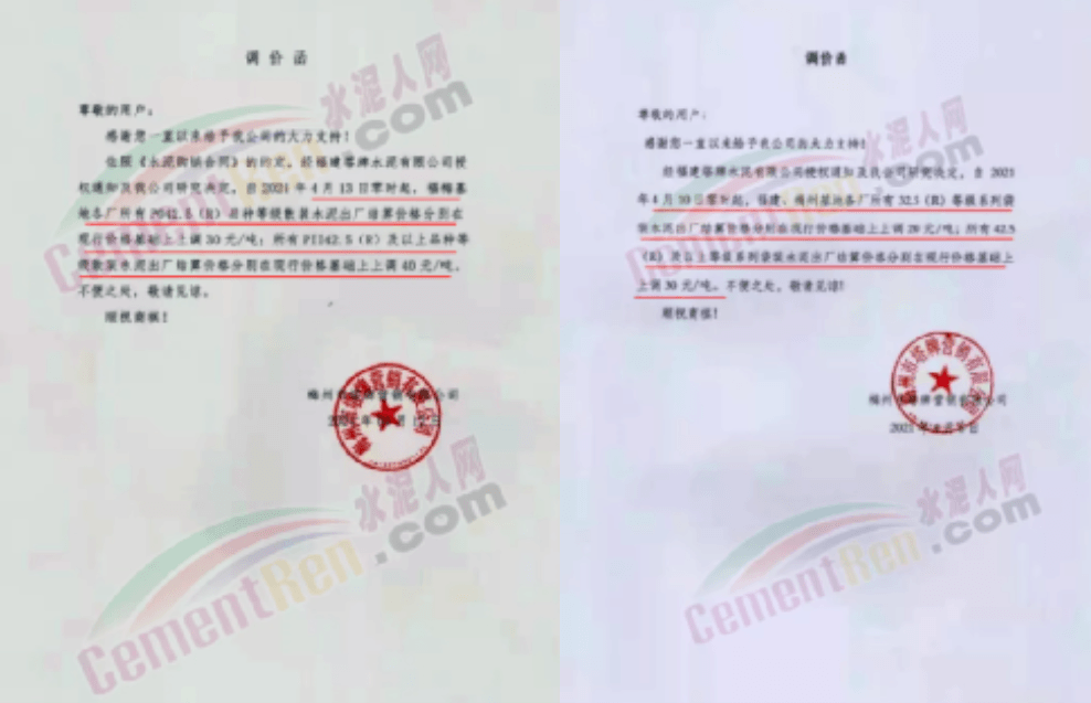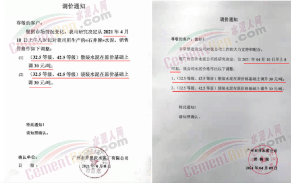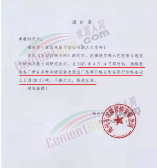 根據當前市場行情,我公司于2021年3月18日早8:00對32.5袋裝水泥上調20元/噸,42.5袋裝上調20元/噸。