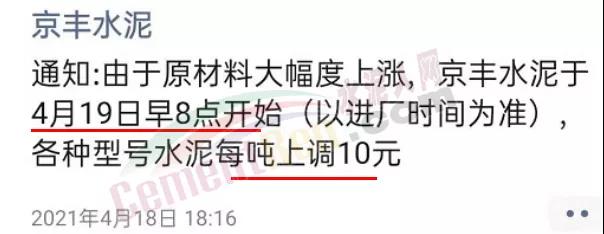 京豐水泥通知由于原材料大幅度上漲,京豐水泥于4月19日早8時上調各型號水泥價格10元/噸。