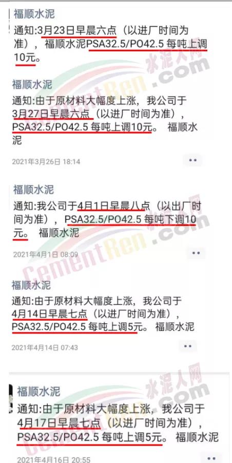 福順水泥通知:由于原材料大幅度上漲,公司于4月17日早七點,PSA32.5/PO42.5上調5元/噸。據水泥人網了解,自3月下旬開始福順水泥已多次上調水泥價格,累計上調40元/噸。