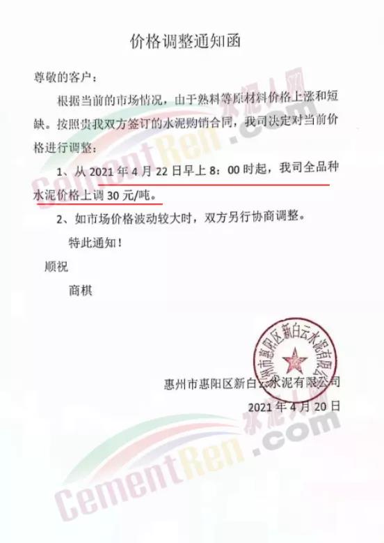 近期珠三角區域再次迎來全品種水泥價格上調30元/噸,惠州市惠陽區新白云水泥有限公司通知根據當前的市場情況,由于熟料等原材料價格上漲和短缺。公司決定從4月22日早上8時起,全品種水泥價格上調30元/噸。