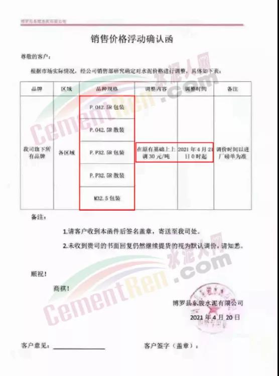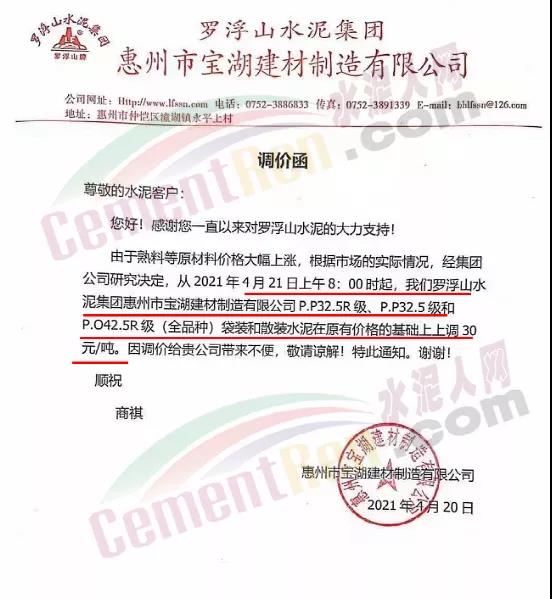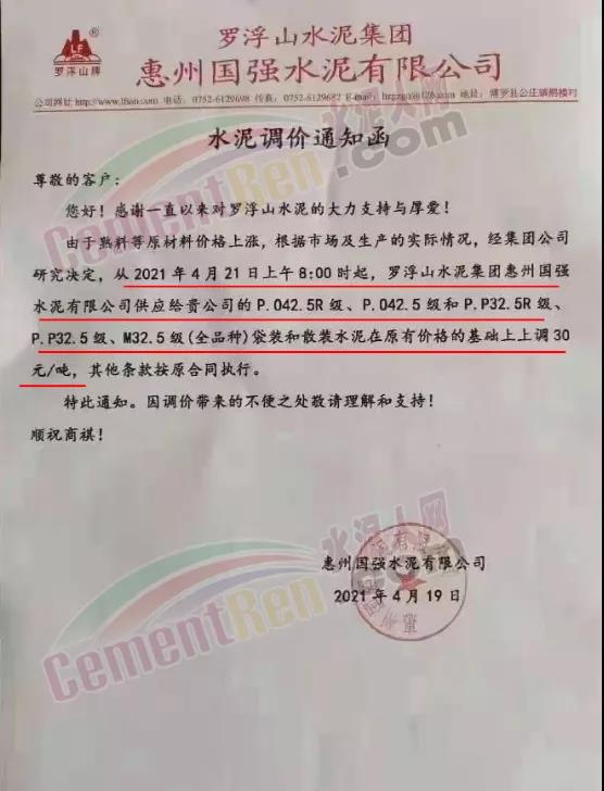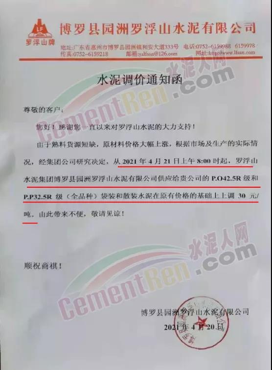 博羅縣園洲羅浮山水泥有限公司羅浮山牌通知由于熟料貨源短缺,原材料價格大幅上漲,根據市場及生產的實際情況,經集團公司研究決定,從4月21日上午8時起,公司P.O42.5R級和P.P32.5R級(全品種)袋裝和散裝水泥在原有價格的基礎上上調30元/噸。
