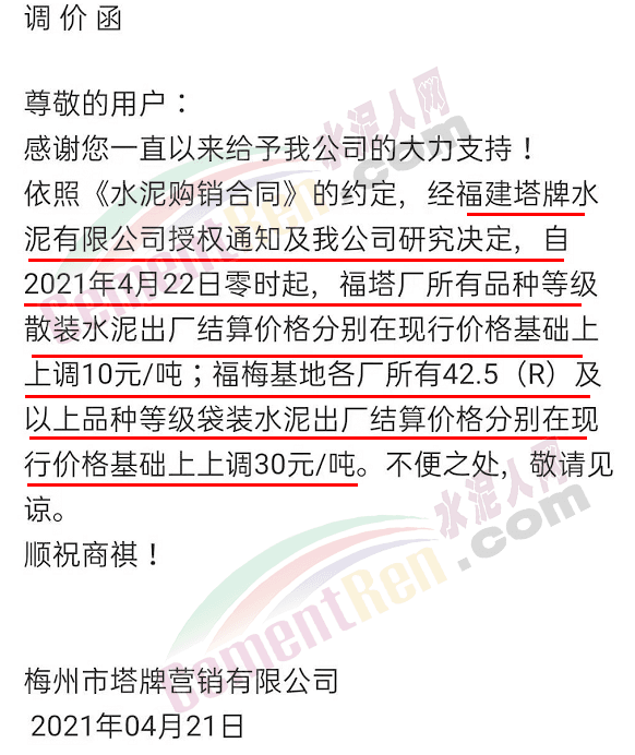 水泥人網通訊員消息 :4月21日梅州市塔牌營銷有限公司再一發函漲價。漲價通知稱,依照《水泥購銷合同》的約定,經福建塔牌水泥有限公司授權通知及公司研究決定,自 2021年4月22日零時起,福塔廠所有品種等級散裝水泥出廠結算價格分別在現行價格基礎上上調10元/噸;福梅基地各廠所有42.5(R)及以上品種等級袋裝水泥出廠結算價格分別在現行價格基礎上上調30元/噸。據水泥人網了解,這已經是該企業近一個月內發布的第9份漲價函了。