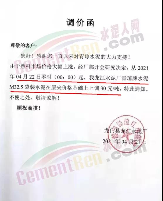龍門縣龍江水泥通知,自4月22日0時起,龍江水泥青瓊牌水泥M32.5袋裝上調 30元/噸。