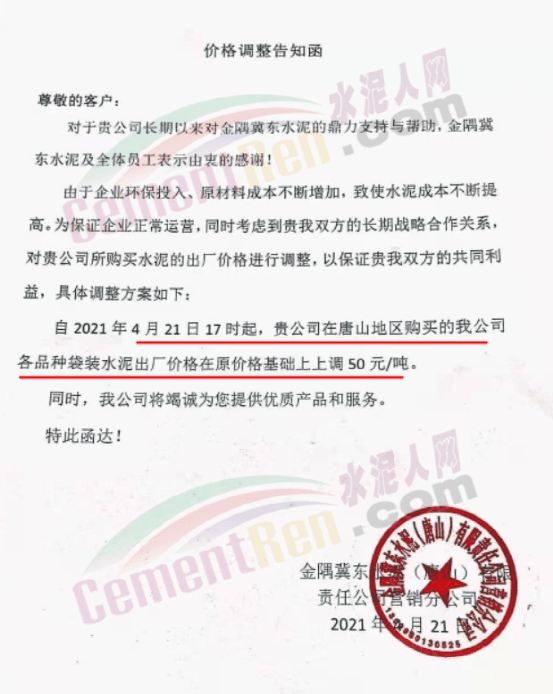 日前,金隅冀東水泥唐山有限責任公司營銷分公司通知,由于企業環保投入、原材料成本不斷增加,致使企業水泥成本不斷提高。為保證企業正常運營,自 4月 21日 17 時起,金隅冀東水泥唐山地區各品種袋裝水泥出廠價格在原價格基礎上上調 50 元/噸。