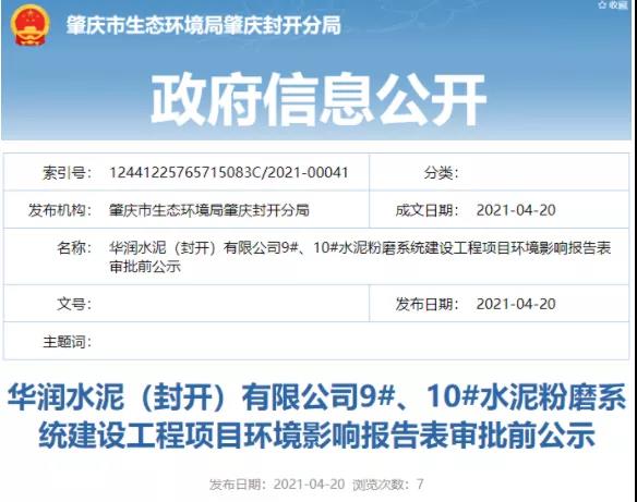 4月20日,廣東省肇慶市生態環境局肇慶封開分局發布《華潤水泥(封開)有限公司9#、10#水泥粉磨系統建設工程項目環境影響報告表審批前公示》提到華潤水泥(封開)有限公司次將新建兩條水泥粉磨(9#、10#)生產線。