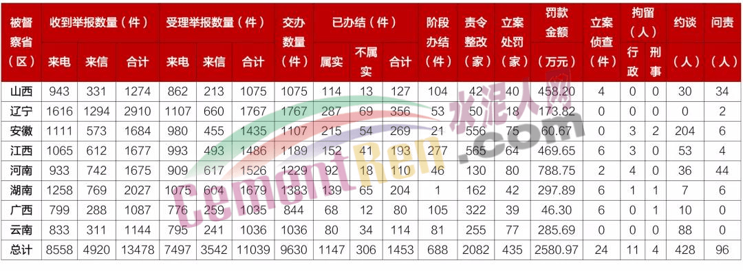 日前,水泥人網從生態環境部獲悉,第二輪第三批中央生態環境保護督察進入下沉工作階段。截至4月19日晚20:00,各督察組共收到群眾來電、來信舉報13478件,受理有效舉報11039件,經梳理合并重復舉報,累計向被督察單位轉辦9630件。據了解,上述舉報中涉及海螺水泥、華新水泥、紅獅水泥、冀東水泥、同力水泥、萬年青水泥等多家水泥企業。