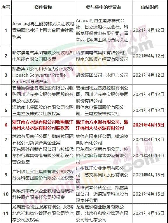 2021年4月12日-4月18日無條件批準經營者集中案件列表