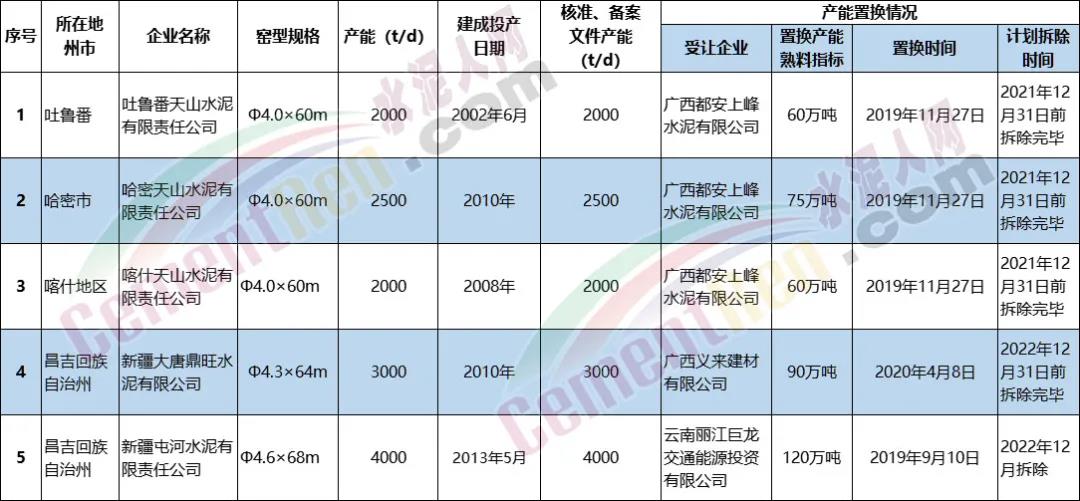 根據(jù)公告《新疆水泥熟料生產(chǎn)線清單(截至2020年12月31日)》顯示,5條水泥熟料生產(chǎn)線共計(jì)405萬噸熟料指標(biāo)已置換,其中4條水泥熟料生產(chǎn)線共計(jì)285萬噸熟料指標(biāo)被置換到廣西,1條水泥熟料生產(chǎn)線合120萬噸熟料指標(biāo)被置換到云南,受讓企業(yè)分別為廣西都安上峰水泥有限公司、廣西義來建材有限公司、云南麗江巨龍交通能源投資有限公司。