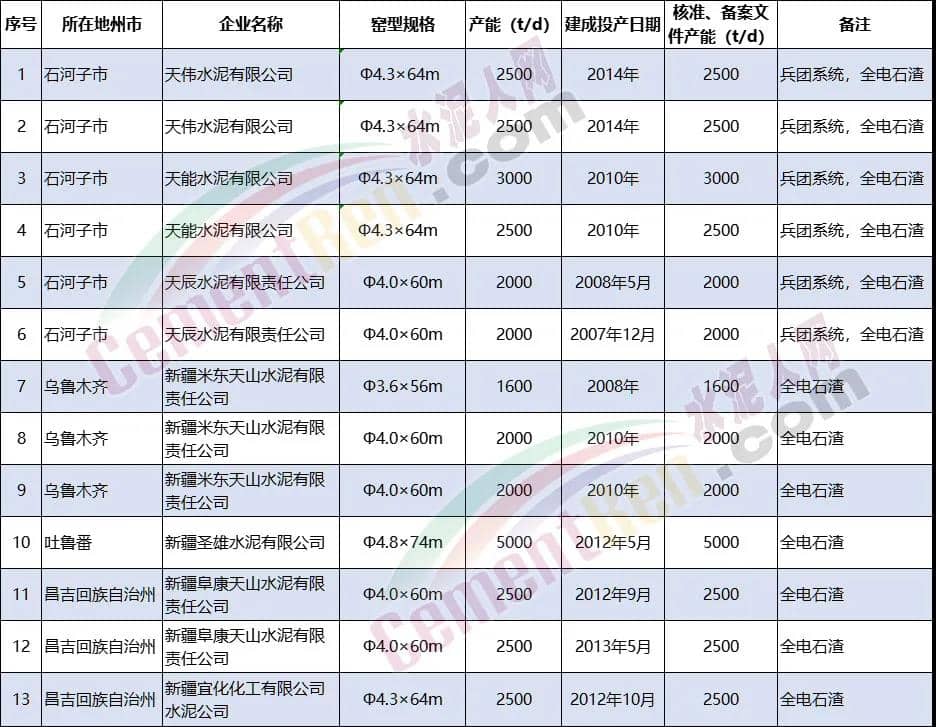 另外59條熟料生產(chǎn)線中包含兵團(tuán)系統(tǒng)17條熟料生產(chǎn)線,合計(jì)產(chǎn)能1599萬噸 。其余42條生產(chǎn)線,合計(jì)產(chǎn)能3915萬噸。