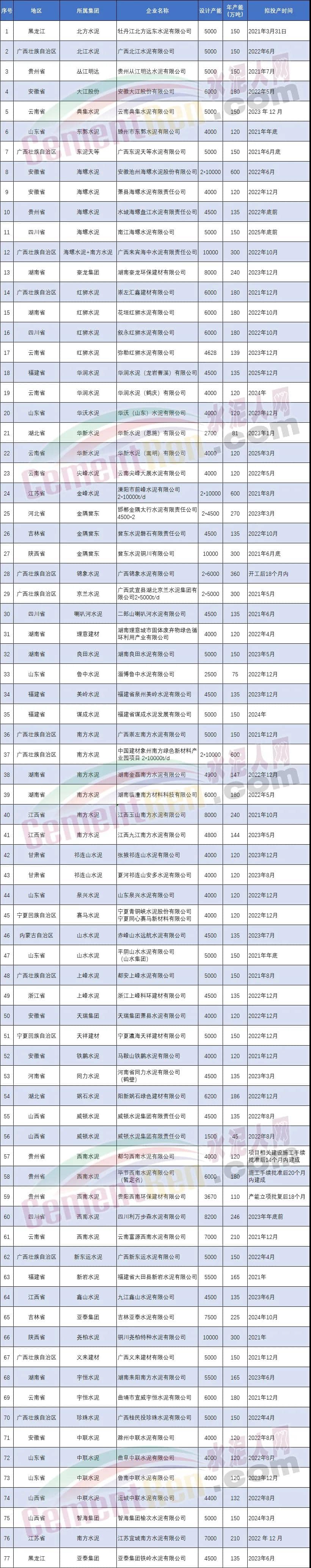 中國建材集團南方水泥、西南水泥、中聯水泥、北方水泥、祁連山、賽馬水泥等多家企業目前在建擬建生產線共22條熟料生產線,合計產能達3539萬噸。