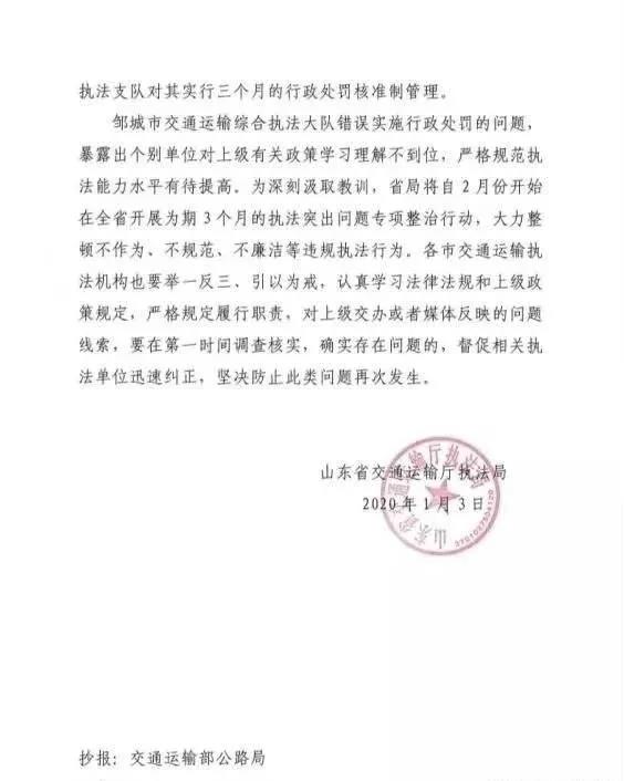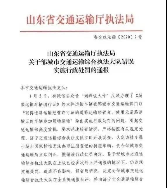 2020年1月3日,山東省交通運輸廳執法局下發了《關于鄒城市交通運輸綜合執法大隊錯誤實施行政處罰的通報》(魯交執法函〔2020〕2號)。1月6日,劍群公司接到了鄒城市交通運輸局簽發的《撤銷案件決定書》,退還罰款8000元。至此,該案宣告銷案。