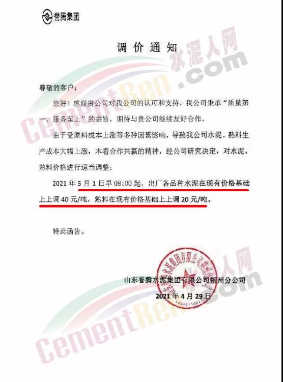 山東譽騰水泥集團有限公司朔州分公司通知由于受原料成本上漲等多種因素影響,導致公司水泥、熟料生產成本大幅上漲,本著合作共贏的精神,經公司研究決定,對水泥、熟料價格進行適當調整。自2021年5月1日早08時起,出廠各品種水泥在現有價格基礎上上調40元/噸,熟料在現有價格基礎上上調20元/噸。