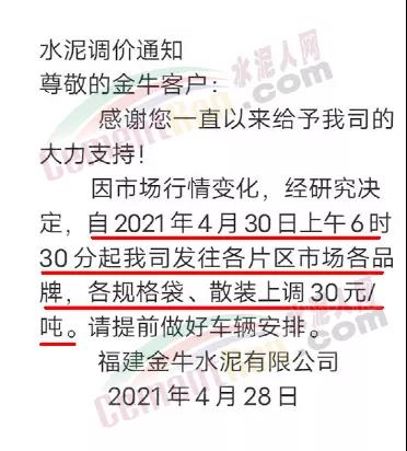 福建金牛水泥有限公司通知自2021年4月30日上午6時30分起公司發往各片區市場各品牌,各規格袋、散裝上調30元/噸。