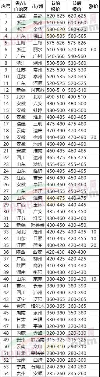 從上述水泥人網信息中心重點監控的五十多個區域近期報價可見,華東及華南地區仍處于價格漲勢較強區域,市場報價多在500元/噸以上,600元/噸以上區域多分布在上海市及周邊浙江各市,節前浙江省杭州市部分主流品牌水泥價格上漲30元/噸,42.5散裝工程配送報價最高已達660元/噸,與超過700元/噸,只差一張“漲價函”了。