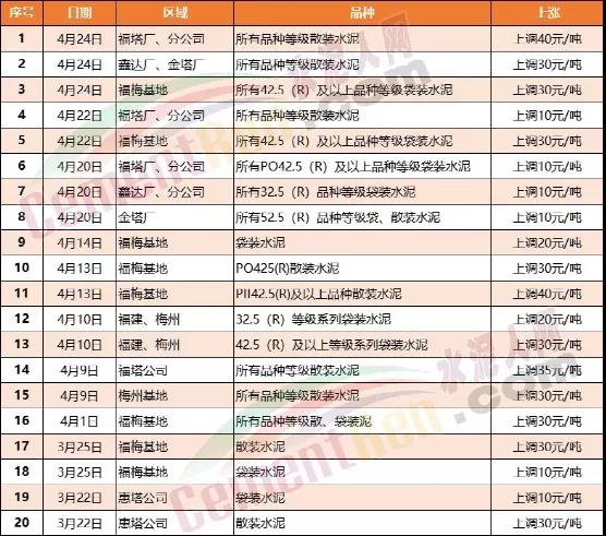 四月初福建三明、南平、龍巖、寧德、南平、泉州、廈門、漳州、莆田、閩南、龍巖等地區塔牌水泥、臺泥水泥、華潤水泥、紅獅水泥、福建春馳等陸續通知上調30-55元/噸。同時外發廣東區域的水泥價格隨廣東區域價格上調而上漲。