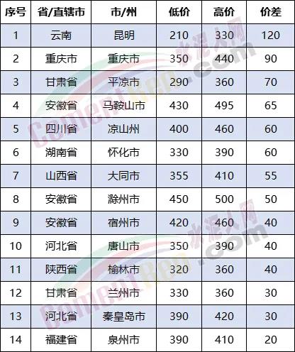 以PO42.5散裝水泥為例,從水泥人網信息中心重點監控的十余個城市來看,重慶市,甘肅平涼市,安徽馬鞍山市、宿州市,四川涼山州,山西大同市,湖南懷化市等不同企業之間的價差均在50元/噸以上,其中價差最大的是云南省昆明市,最高報價和較低報價之間相差120元/噸。