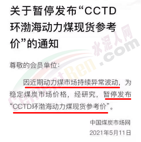 5月11日,中國煤炭市場網(wǎng)通知:“因近期煤市持續(xù)異常波動,為穩(wěn)定市場價,經(jīng)研究,暫停發(fā)布環(huán)渤海動力煤現(xiàn)貨參考價... ...”