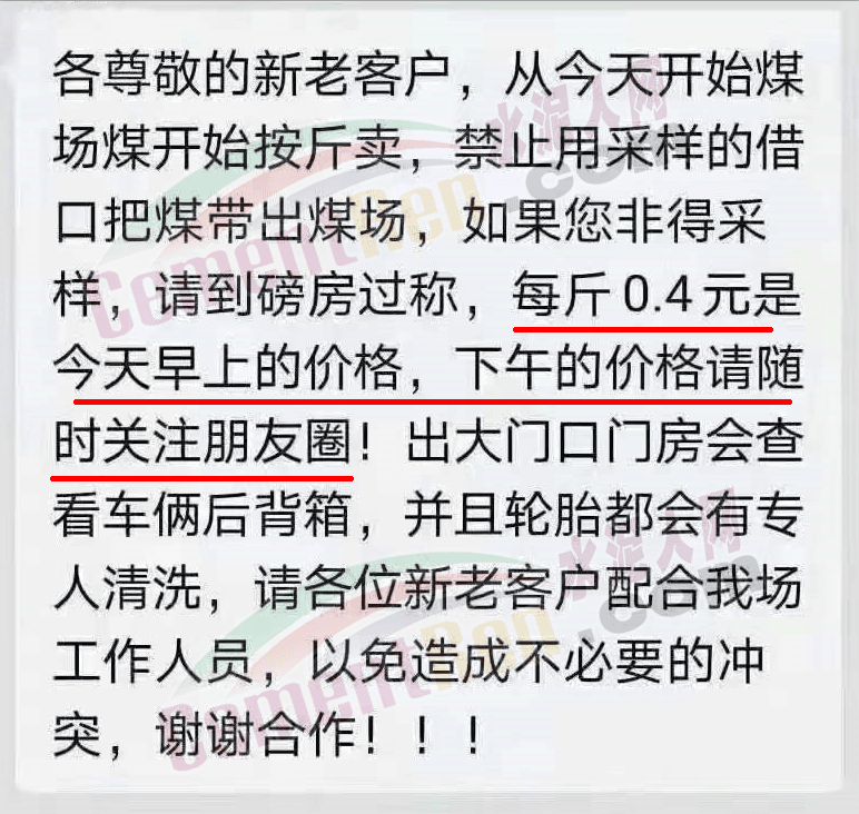 有煤場發(fā)消息稱:“各尊敬的新老客戶,從今天開始煤場煤開始按斤賣,禁止用采樣的借口把煤帶出煤場,如果您非得采樣,請到磅房過稱,每斤0.4元是今天早上的價格,下午的價格請隨時關(guān)注朋友圈!出大門口門房會查看車倆(輛)后背箱,并且輪胎都會有專人清洗,請各位新老客戶配合我場工作人員,以免造成不必要的沖突,謝謝合作!!”
